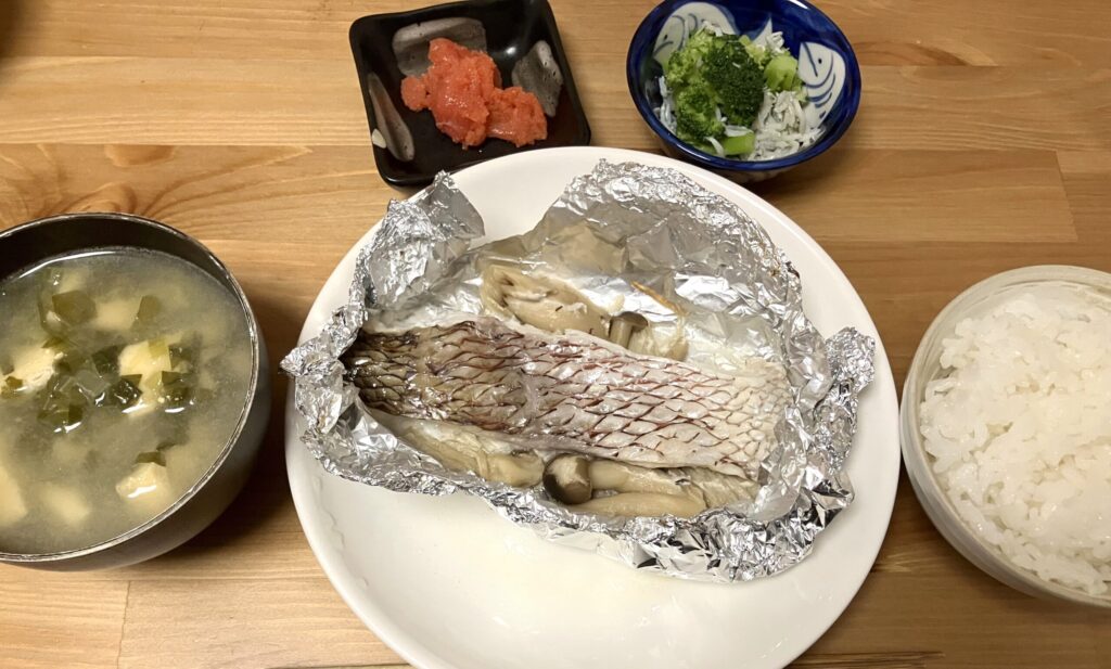 今日は包んで焼くだけのメイン+混ぜるだけの副菜+白だし味噌汁。
