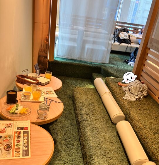 寝転がせられる座席スタイルの席で、ベビーカーのまま入ることができないので注意が必要です。ベビーカーは入り口に置いておけます。 - にぎやかな雰囲気