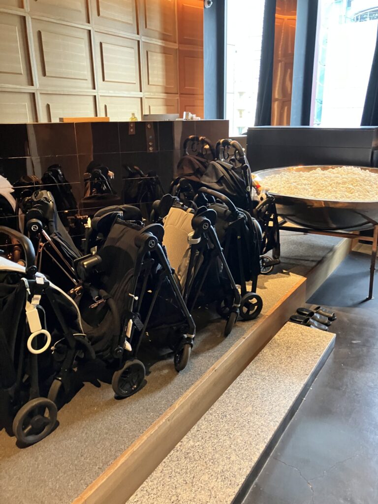 わが家は0歳児を連れて行きましたが、店員さんも子どもに優しく声をかけてくれました。ベビーカーのまま入店はできないので、ベビーカーを入り口に置いて席に案内されます。